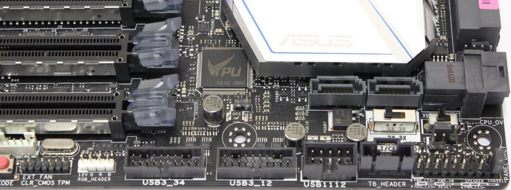 Рядом с переключателями расположены светодиоды для того, чтобы понимать какой из режимов сейчас включен. Здесь же расположен джампер Overvoltage. Он может пригодиться разве что для экстремального разгона, поскольку в BIOS даже если его не активизировать максимальное значение и так очень высокое. Переходим к нижнему краю и обнаруживаем там коннектор для подключения к дочерней плате ThunderboltEX 3. Собственно он так и называется TB_HEADER. Сразу же хочу напомнить, что кабель есть в комплекте поставки.