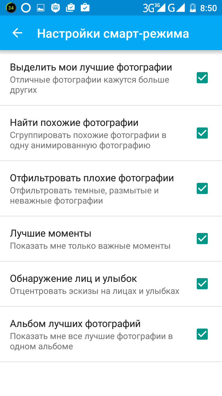 Смарт-режим также настраивается, равно как и без проблем отключается в правом верхнем углу экрана. Здесь можно включить/отключить поиск похожих фото, фильтрацию снимков низкого качества, отображение лучших моментов, обнаружение лиц и улыбок и персональный альбом. Надо отметить, что это дело действительно работает, особенно, функция определения портретов.