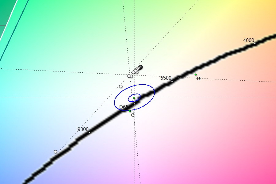 Пожалуй, только эта картинка не позволит назвать экран «идеальным». Все поголовно точки серого клина вылетели за границу большого синего овала, обозначающего границу DeltaE<10. Паразитные оттенки, хоть и в небольших размерах, присутствуют, хотя реально это и не заметно. Могу допустить, что люди художественных профессий эти оттенки смогут заметить.