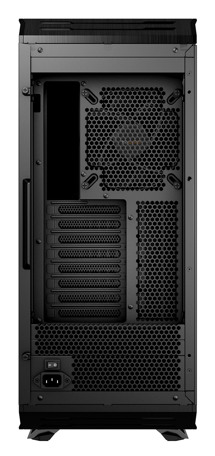 Сзади все стандартно для компоновки с нижним расположением блока питания. Над его посадочным местом располагаются восемь слотов расширения с металлическими заглушками. Выше находится вырез для коммуникационных портов материнской платы и фирменный вытяжной вентилятор 140 мм с аэродинамическими лопастями.