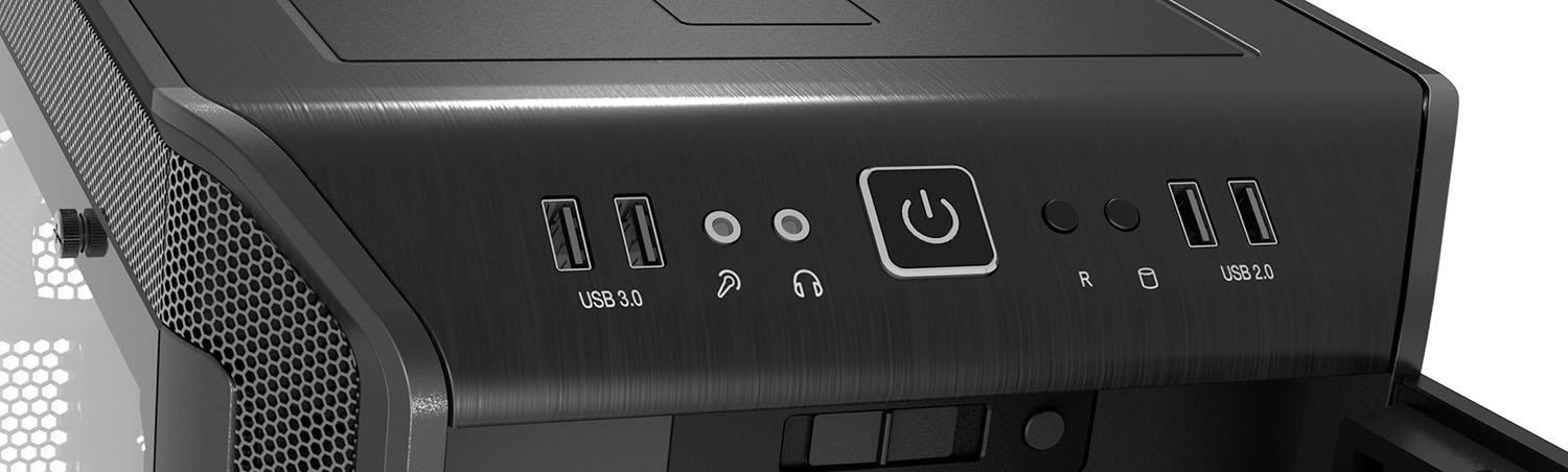 В его состав входят два порта USB стандарта 3.0, разъемы наушников и микрофона, кнопка включения питания, совмещенная со светодиодным индикатором, кнопка экстренной перезагрузки, индикатор активности дисковой подсистемы и пара USB 2.0.