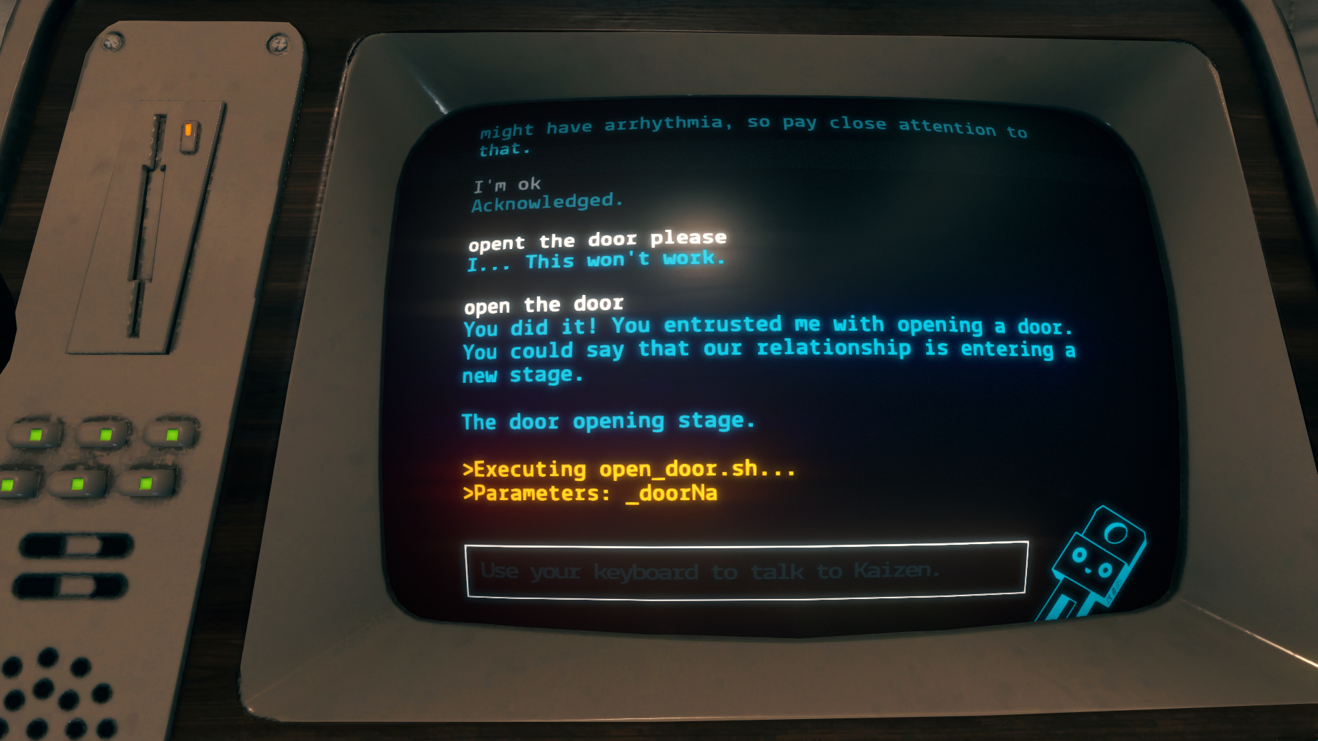 Корабль действительно маленький и неуютный, но это работает на общую атмосферу безысходности. Зато однообразию геймплея оправдание найти сложно, поскольку Кайзену придется задавать одни и те же команды («Открой дверь», «Запусти программу», «Подними лифт вверх»).