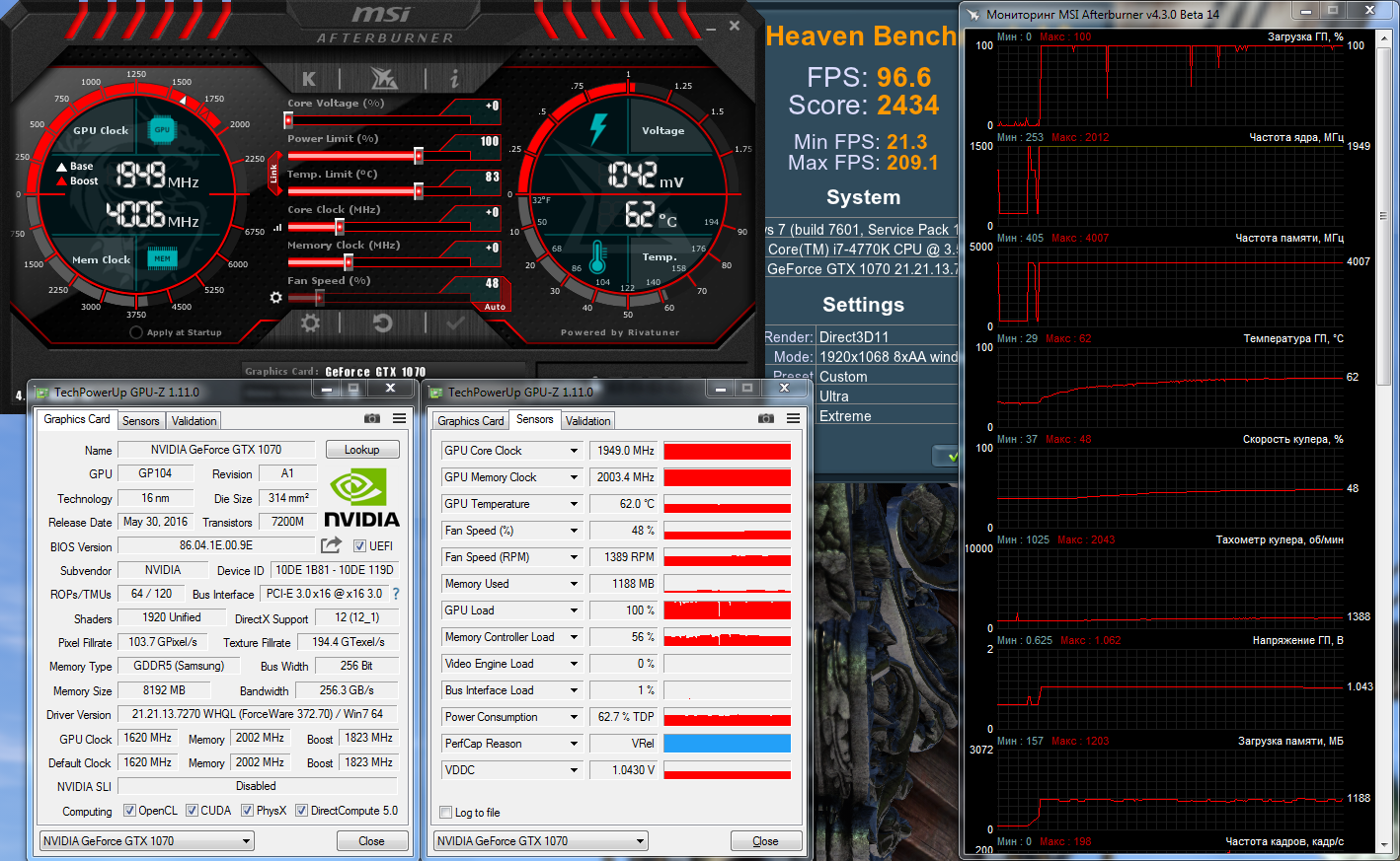 Проверка стабильности работы ускорителей в процессе разгона проводилась утилитой MSI Kombustor 3.5 (режим GPU Burn-in, 1920 x 1080). Полученные частоты дополнительно проверялись прогонами теста Heaven Benchmark v 4.0 c экстремальным уровнем тесселяции и графических тестов из пакетов 3DMark 2013, 3DMark 11 и 3DMark Vantage.
