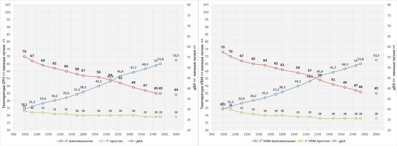 Далее приведем график зависимости температуры графического ядра/системы питания и шума от оборотов вентиляторов системы охлаждения. Данная видеокарта лишена датчиков в области цепей питания, поэтому результаты силовой части были получены с помощью пирометра.
