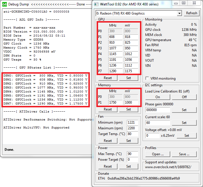 Утилиты AIDA64 и WattTool раскроют нам значения напряжений, зашитых в восемь показателей DPM. Для максимального значения частоты ядра 1290 МГц разработчики установили 1.175 В, что сказалось на возросшем потреблении.