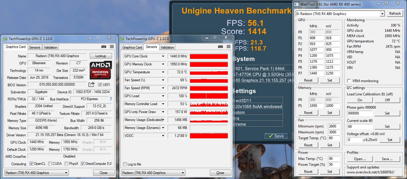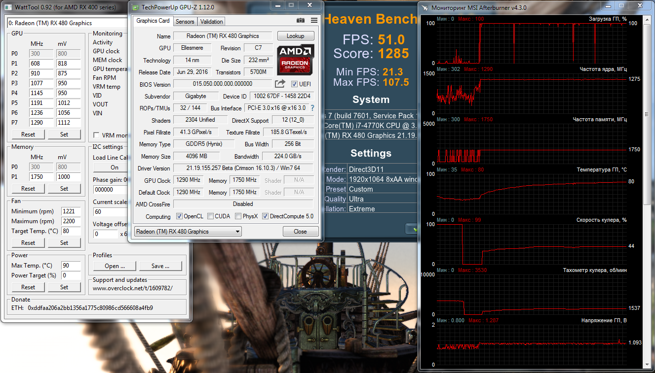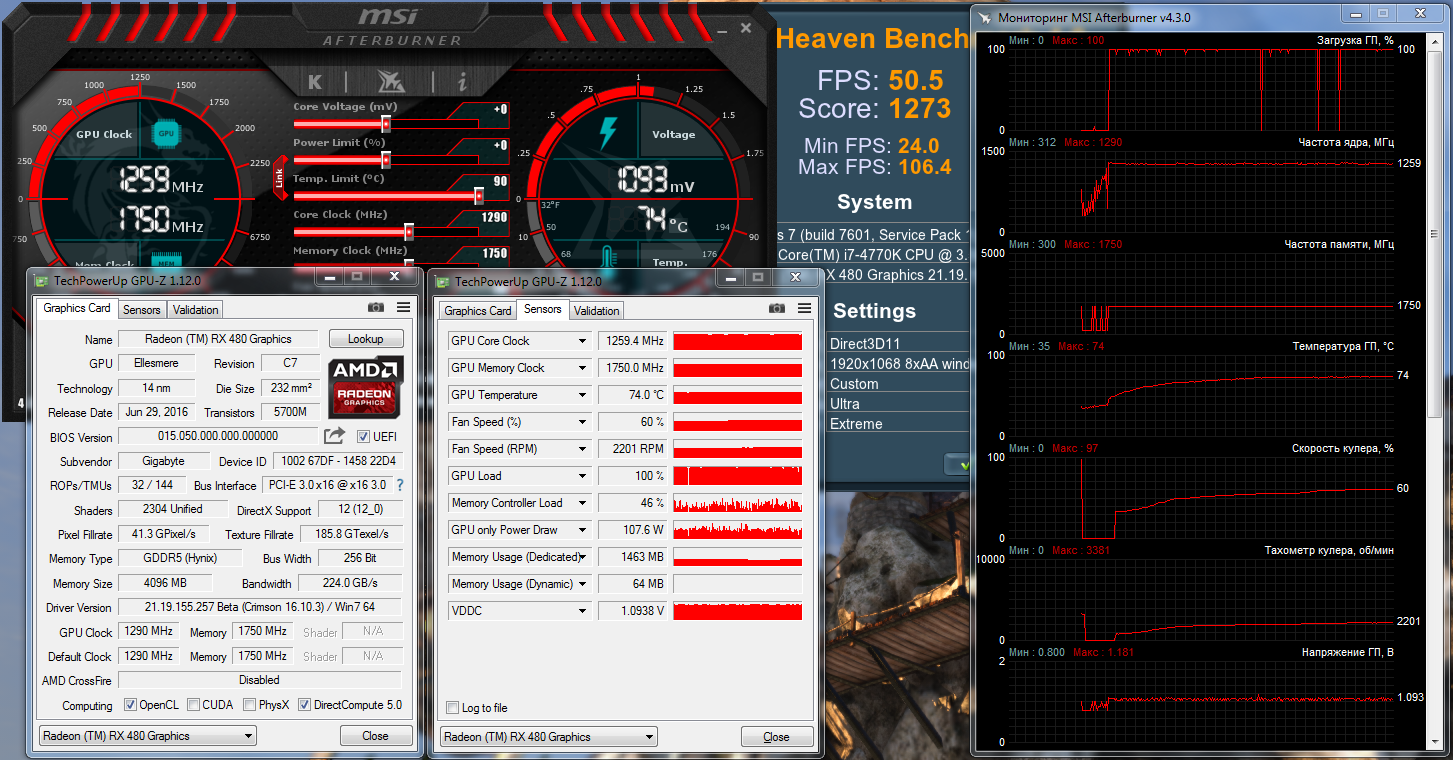 Теперь оценим результаты личных трудов по настройке Gigabyte Radeon RX 480 G1 Gaming с помощью параметров в BIOS. За основу взята та же версия F4.