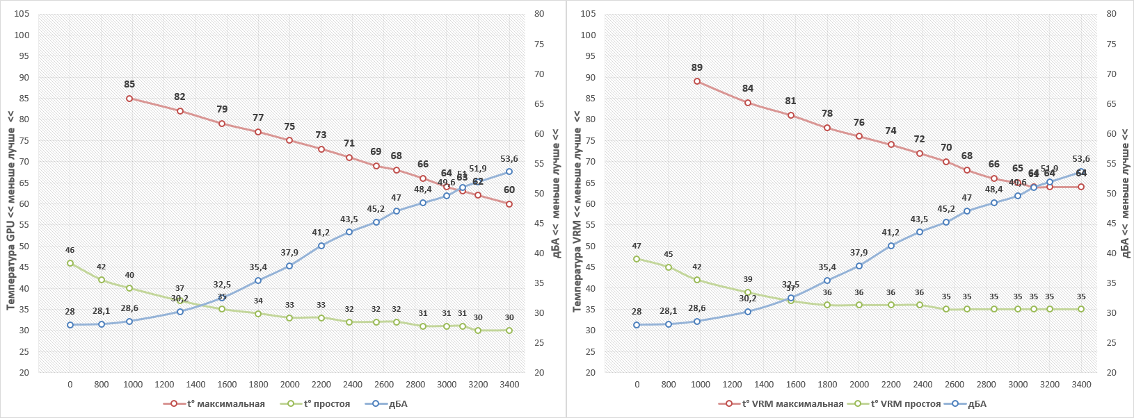 При бездействии вентиляторы останавливаются, ключевым значением для их старта является отметка 48°C. В таком режиме были получены следующие результаты: