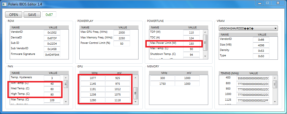 На момент написания материала была доступна утилита Polaris BIOS Editor версии 1.4. Сразу отмечаем невысокое значение Max Power Limit в 127 Вт, которое Gigabyte Radeon RX 480 G1 Gaming удерживает во всех играх и бенчмарках. Очень неоднозначный показатель для видеокарты с качественной подсистемой питания и восьмиконтактным коннектором. Остальные параметры ничем интересным не выделялись.