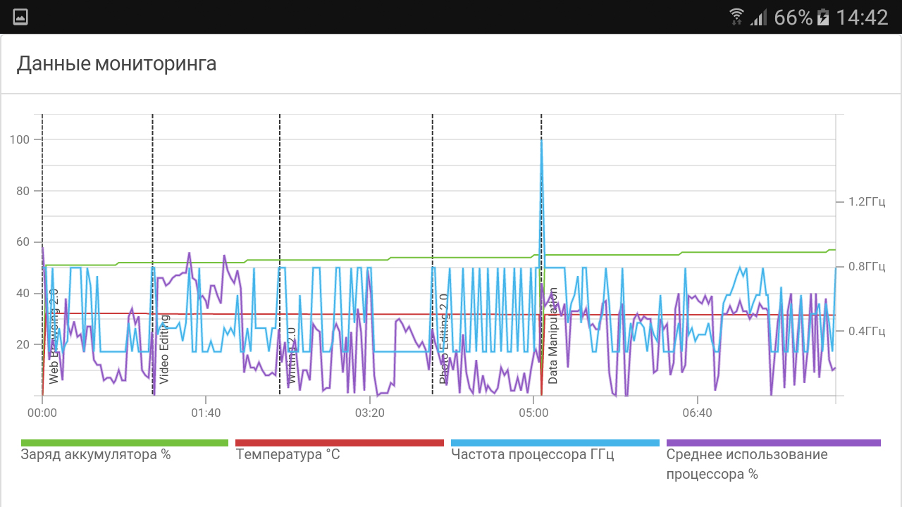 С некоторыми оговорками можно принять заявленные цифры. Из недостатков стоит отметить, что видеопоток иногда подвисает и воспроизводится рывками, но происходит это не очень часто. Тут на стороне смартфона не самый яркий AMOLED-экран и «умная» система понижения частоты работы ядер.