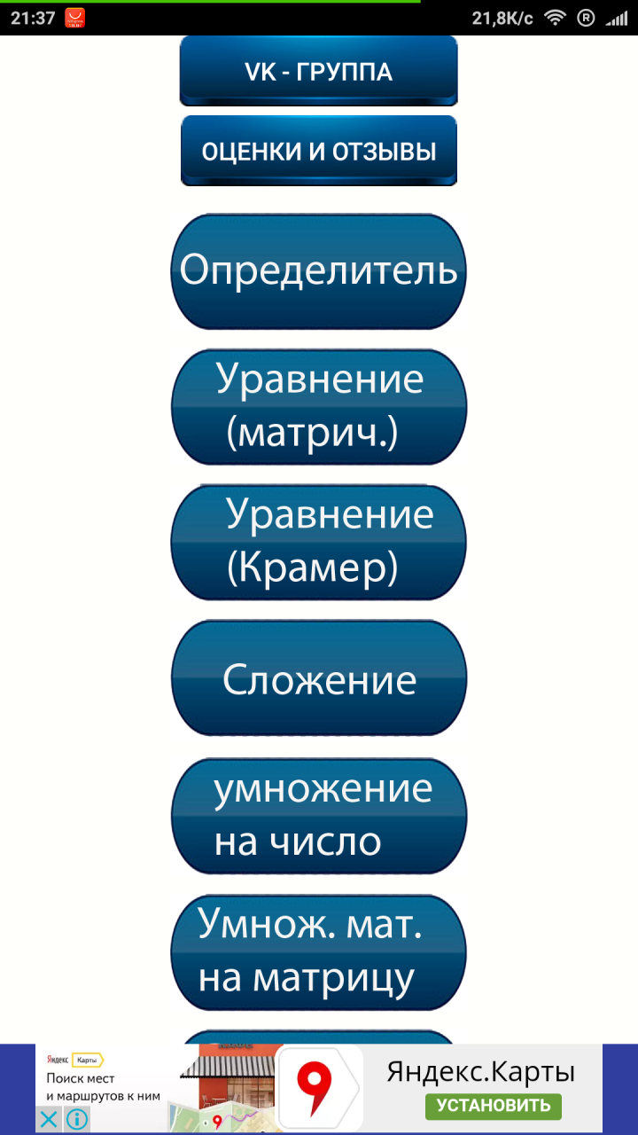 Интерфейс матричного калькулятора «Решение матриц» представлен в виде очень необычного вертикального меню. На нем располагаются «кнопки» с доступными функциями по преобразованию матриц (я насчитал таких аж семь штук), а также ссылки на официальную группу в социальной сети ВКонтакте и оценки/отзывы в Google Play.