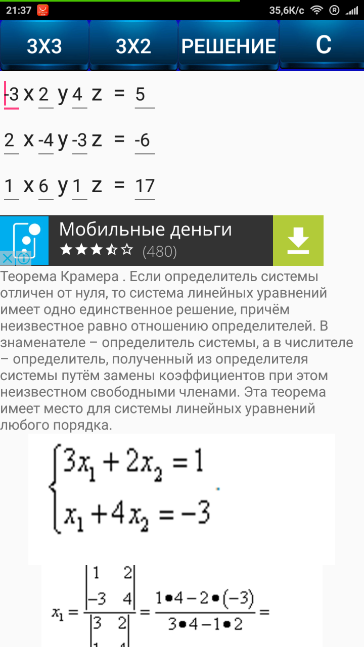 Отдельное спасибо разработчику за возможность смены матриц местами и два метода их решения: методом Гаусса и методом Крамера.
