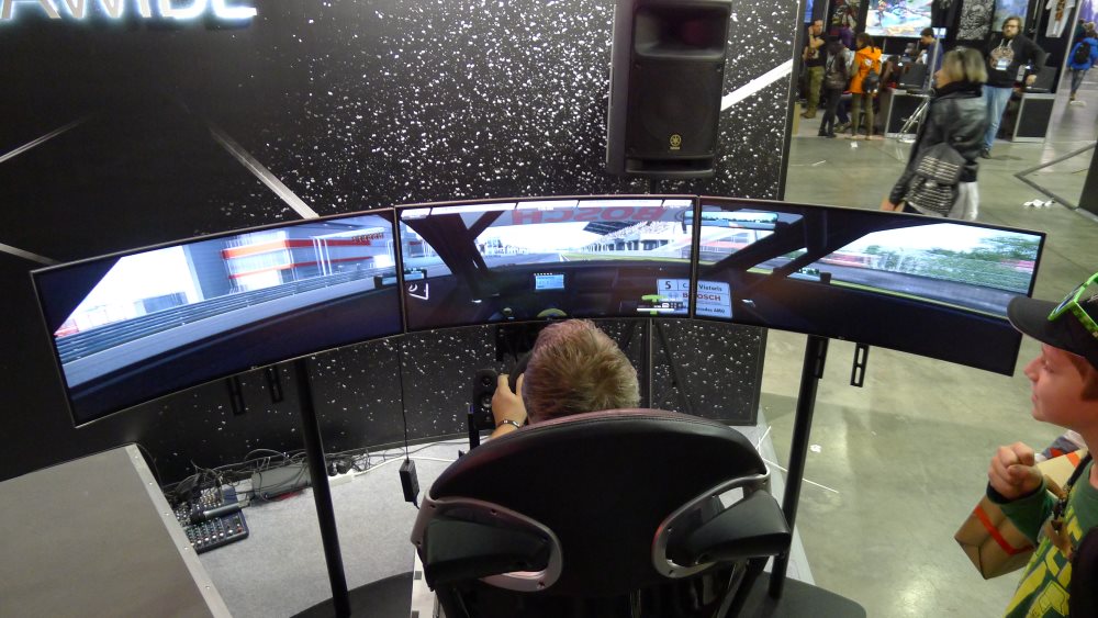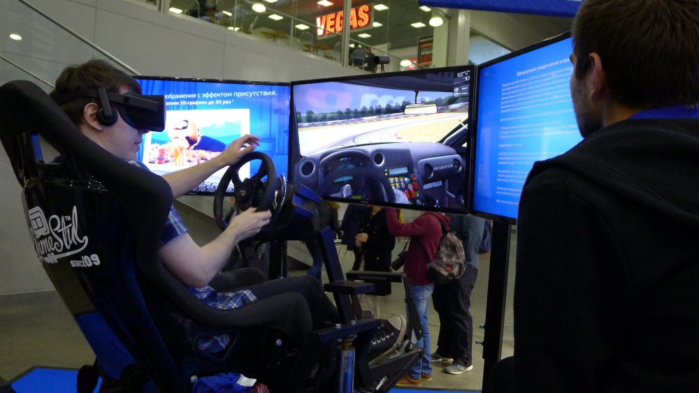 Все крупные производители располагали своими стендами с демонстрацией технологии VR. Мне показалось, что это было обусловлено тем, что никому не хотелось отставать друг от друга и все хотели продемонстрировать что они уже могут и готовы к данному новшеству. Хотя следует отметить, что технология не является принципиально новой. Шлемы виртуальной реальности уже были, а сейчас мы по сути наблюдаем новый виток эволюции. Не нравится шлем на голове? Пожалуйста, можно по-старинке за тремя изогнутыми мониторами погрузиться в среду.