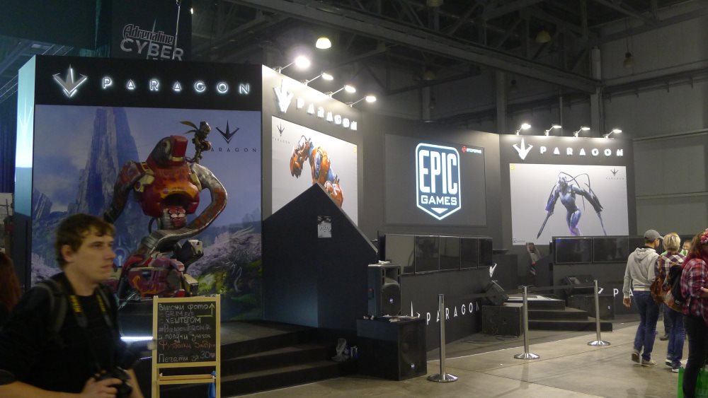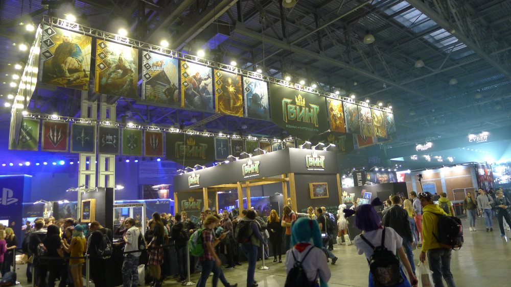 Что еще мы видим? Огромные баннеры, огромный экран с которого безостановочно льется реклама компании, большая сцена и большое количество игровых станций около нее.