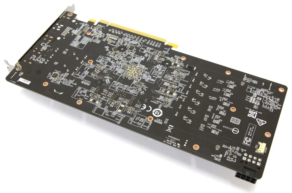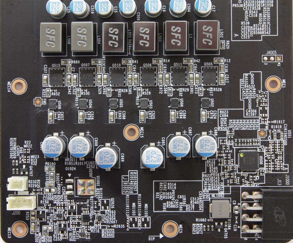 На каждую фазу приходится по одной супер ферритовой катушке. Кроме этого здесь используются твердотельные конденсаторы. Дополнительное питание подается на видеокарту через единственный разъем 8-pin PCI-e.