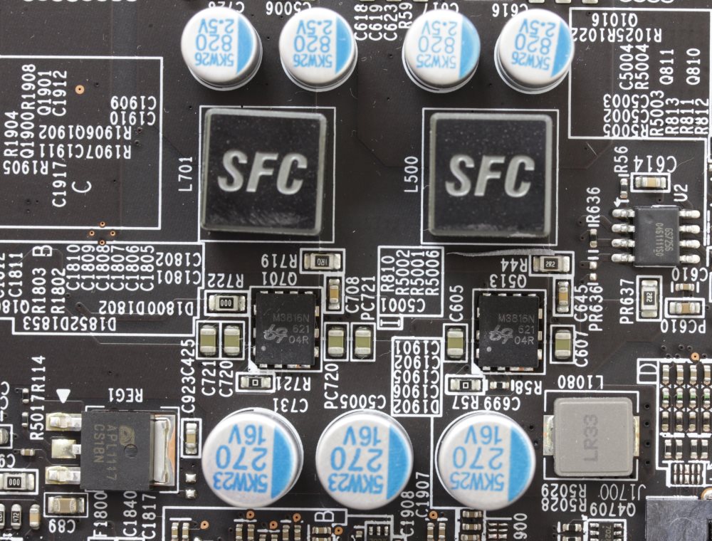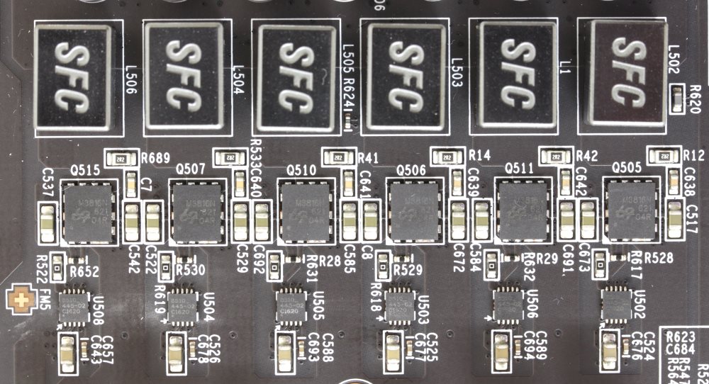 На каждую из шести фаз, питающих графический процессор, приходится по одной транзисторной сборке UbiQ Semiconductor M3816N. Рядом с каждой такой микросхемой распаяно по одному драйверу International Rectifier CHL8510.