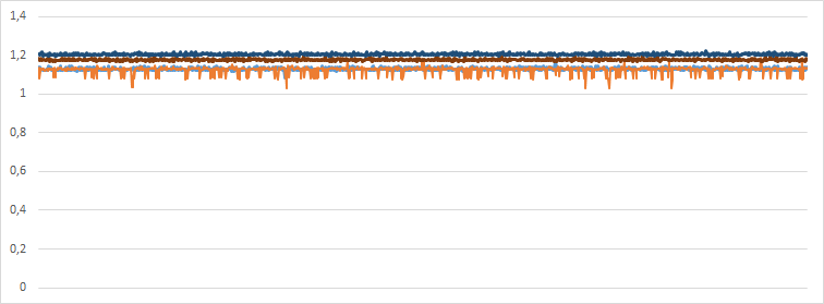 Здесь у нас четыре режима работы видеокарты. Первый – без разгона, голубая линия, и как видно, частота держится на отметке 1256 МГц и лишь на доли секунды отклоняется с 1256 МГц до 1231 МГц. Второй – с разблокированными блоками, оранжевая линия, частота прыгает между 1256 МГц и 1208 МГц, что в среднем дает 1239 МГц. После разгона и увеличения максимального энергопотребления оба режима копируют друг друга с частотой 1325 МГц без малейших отклонений от этой линии.