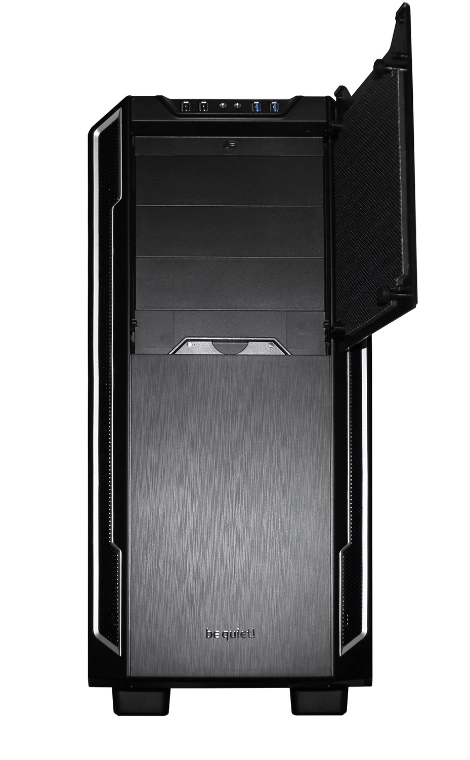Несмотря на то, что она пластиковая, тактильно дверца ощущается достаточно надежной, благодаря шумопоглощающей накладке из специального материала. За ней скрываются три заглушки под устройства 5.25". Под ними видно ручку пылевого фильтра.