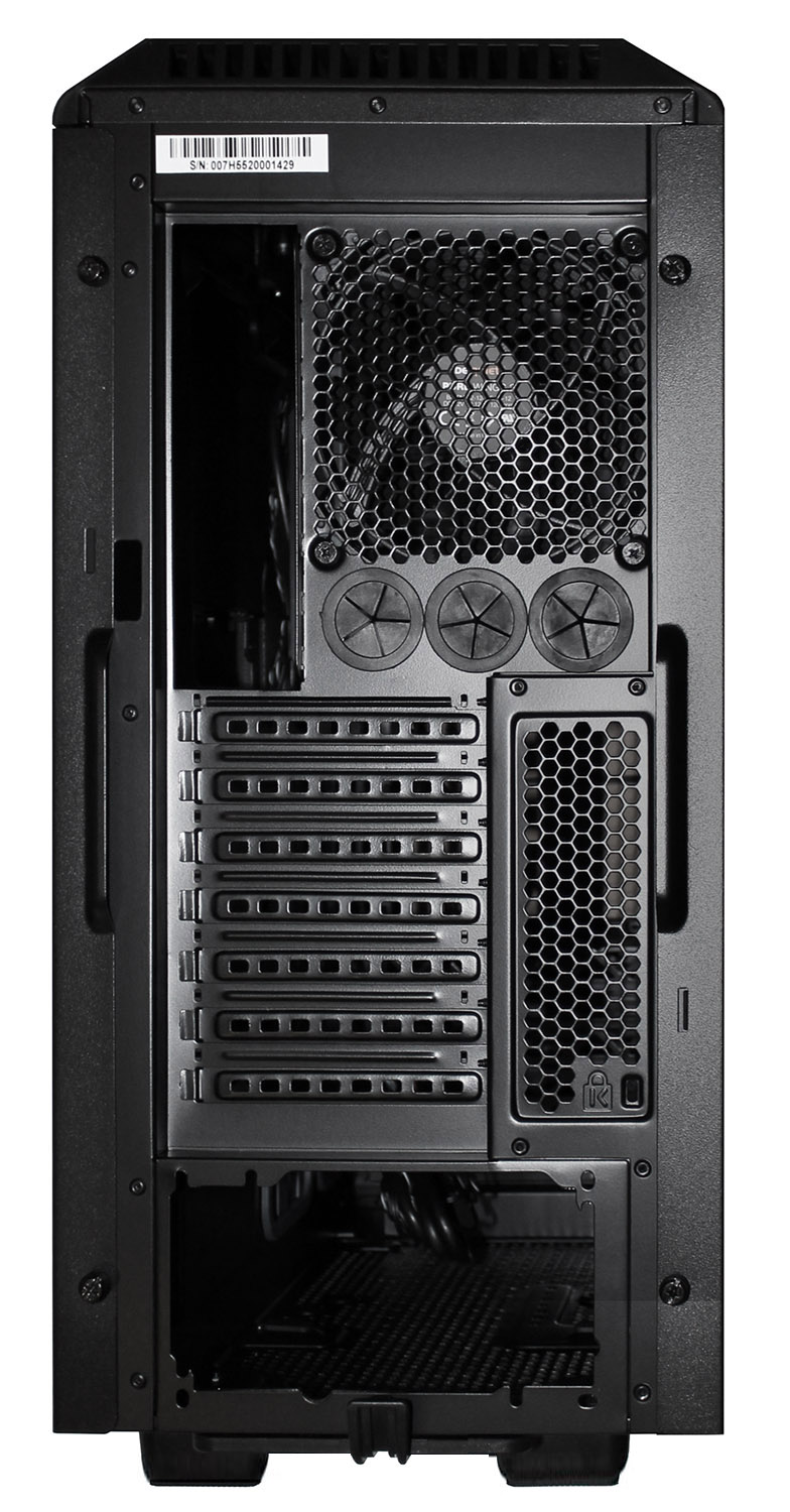 Сзади все стандартно для корпуса с нижним размещением блока питания. Над его посадочным местом располагаются семь слотов расширения с металлическими заглушками.