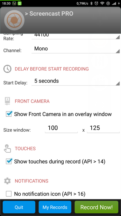 Настройки приложения Screencast разделены на несколько разделов, в которых можно выставить параметры записи видео, аудио, указать таймаут, добавить отображения нажатий, уведомления и даже изображение с фронтальной камеры.