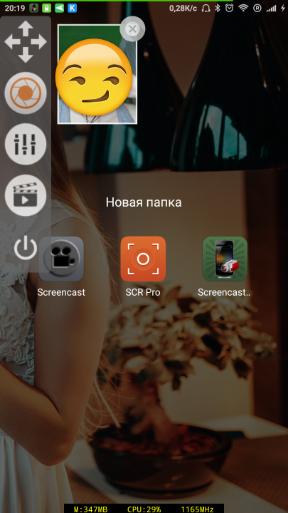 Еще стоит отметить наличие «плавающего виджета». Он позволяет быстро перейти к записи видео с экрана, открыть параметры приложения, галерею и закрыть программу.