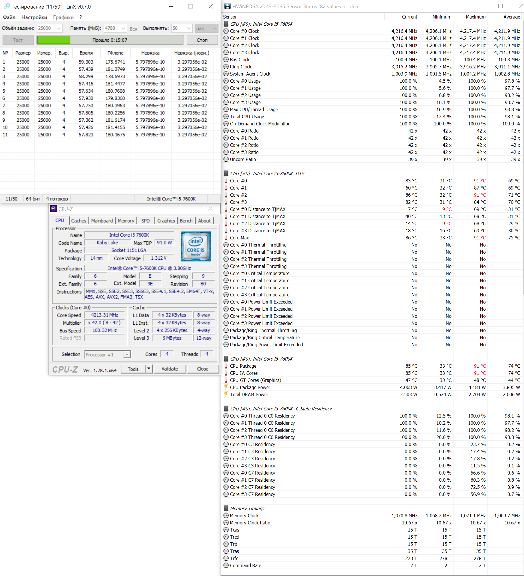 Под нагрузкой множители не снижаются, и ЦП продолжает работать на частоте 4.2 ГГц с напряжением в 1.32 В. В таких условиях даже продвинутая СВО (помпа Laing DDC 3700 об/мин, водоблок EK Supreme High-Flow, радиатор Phobya G-Changer 240 V.2 со шлангами 13/19 мм) сдает позиции. Постепенно температура процессора поднялась до 91°C.