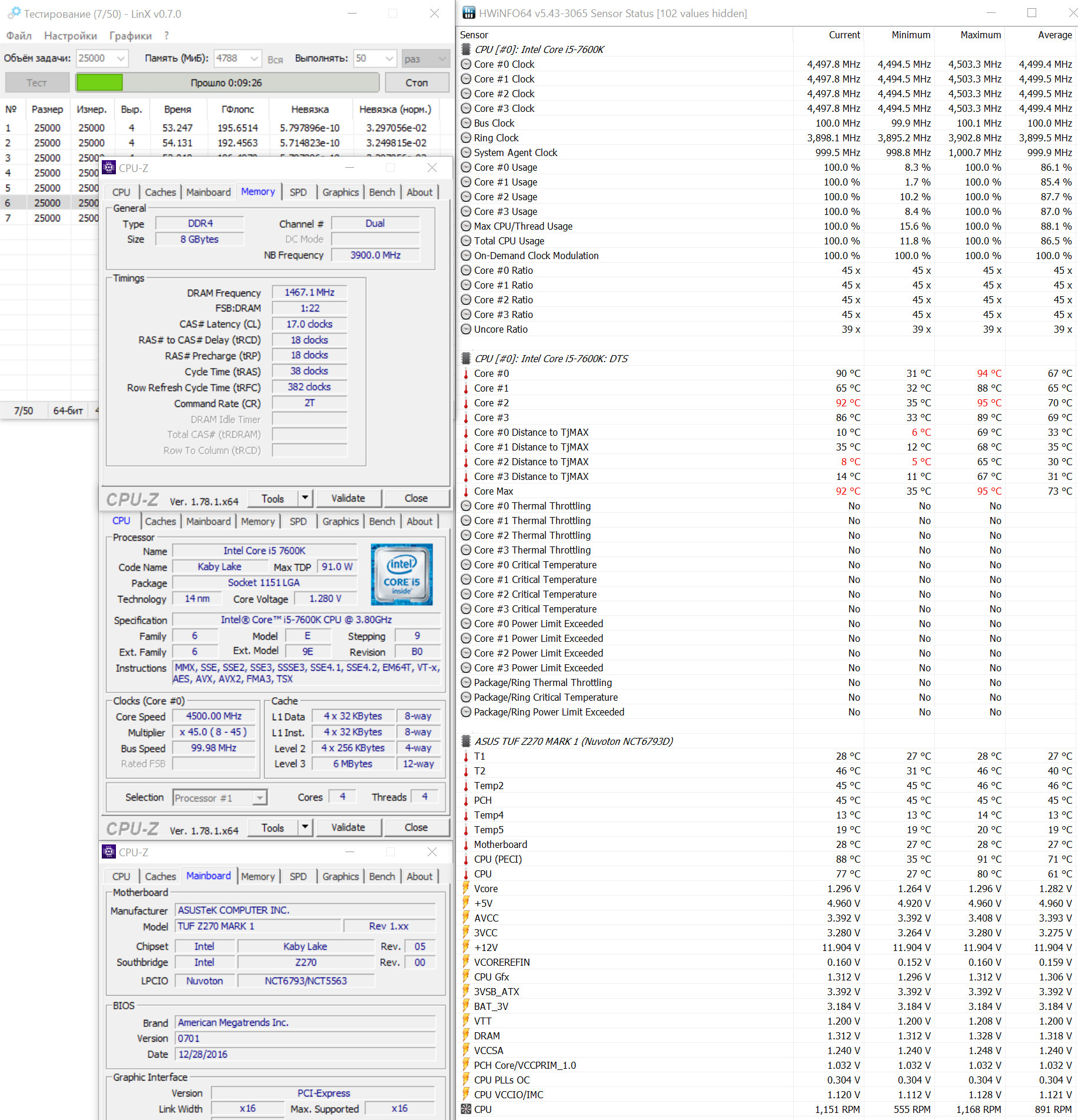 Стандартную проверку на разгон материнская плата прошла успешно, но только частично. Стендовый CPU легко разогнался до 4.6-4.7 ГГц с тестированием в Prime95. В LinX он быстро перегревался, в этом приложении стабильной частотой оказались 4.5 ГГц при относительно умеренной максимальной температуре 95°C.