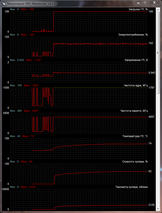 Для разгона видеокарт, а также мониторинга температур и оборотов вентиляторов использовалась фирменная утилита MSI Afterburner v4.3.0.