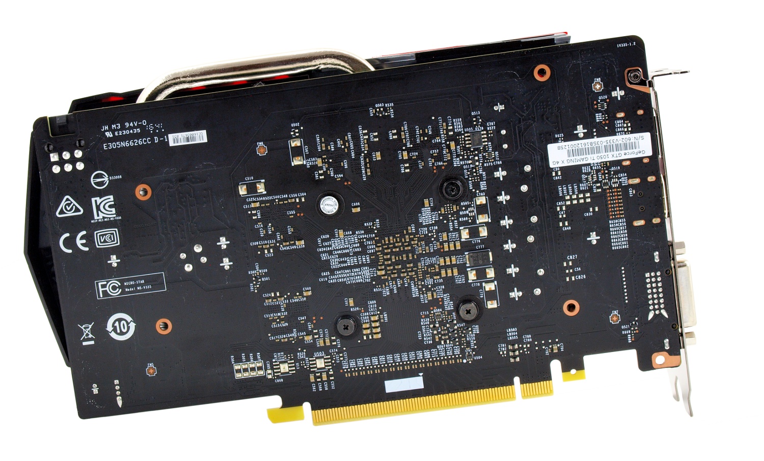 Обратная сторона новинки полностью открыта для изучения PCB. Для более экономичной и прохладной версии GeForce GTX 1050 Ti разработчики отказались от «бэкплейта», который бы только сказался на ее конечной стоимости. К тому же модуль получилась очень легкой, всего 527 г, и элемент жесткости ей не к чему.