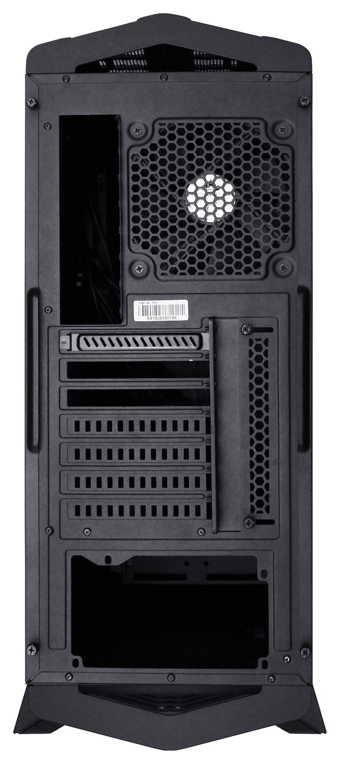 Сзади все стандартно для компоновки с нижним расположением блока питания. Над его посадочным местом предусмотрено семь слотов расширения с металлическими заглушками. Выше находится вырез для коммуникационных портов материнской платы и 120 мм вытяжной вентилятор (установлен по умолчанию).
