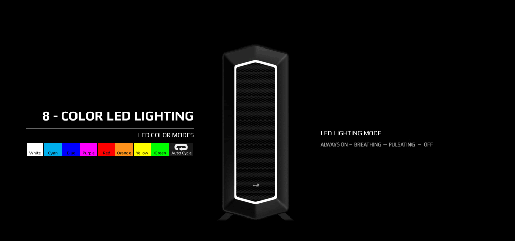Что касается внешнего вида, то его оценка всегда субъективна, но и у такого «шестиугольного» решения найдутся свои сторонники. Не забудем и изюминку Aerocool P7-C1 – светодиодную подсветку передней панели с восемью цветами, тремя режимами работы (стандартный, пульсация, «дыхание») и поддержкой цикличной смены цветов.