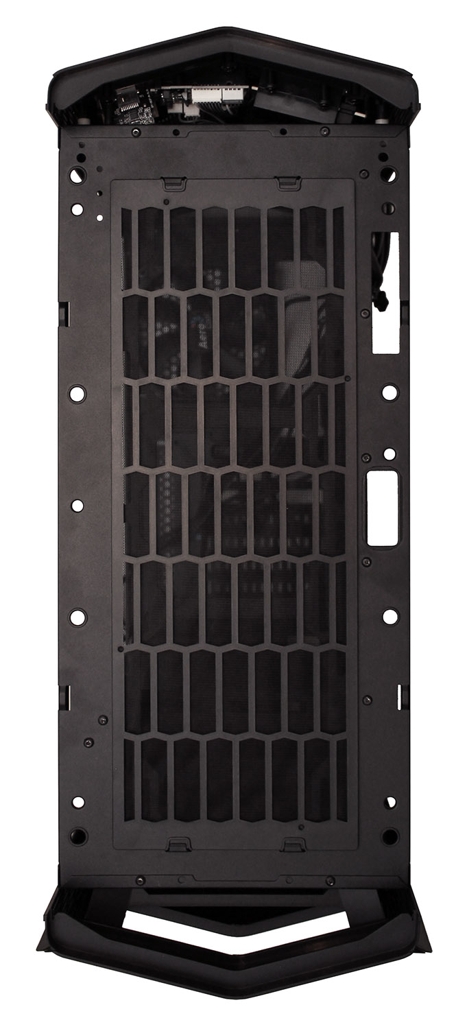 Над секцией БП расположен отсек материнской платы. Крупный вырез в поддоне за процессорным разъемом должен позволить устанавливать прямо в корпусе даже системы охлаждения CPU, крепление которых использует backplate (упорную крестовину, располагающуюся с обратной стороны платы).