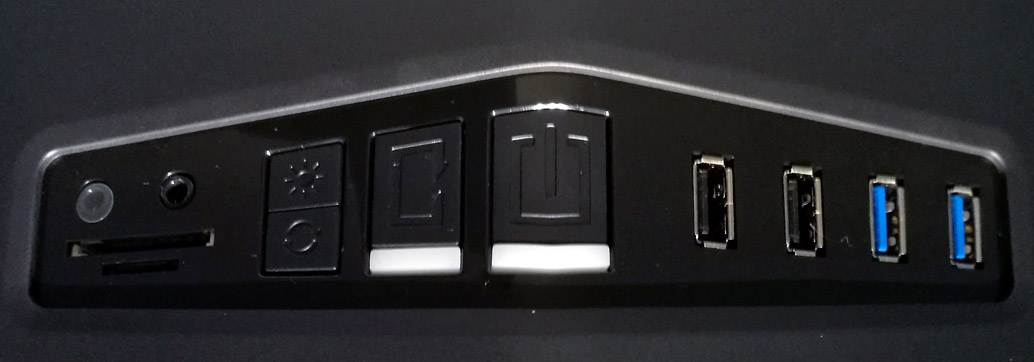 Перечислим его элементы слева-направо: разъемы наушников и микрофона, под которыми находится картридер формата SD, SDHC, SDXC, microSD, microSDHC, microSDXC. Далее – две кнопки выбора цвета подсветки и ее режима, кнопка экстренной перезагрузки, кнопка питания по центру, два порта стандарта USB 2.0 и два порта USB 3.0.
