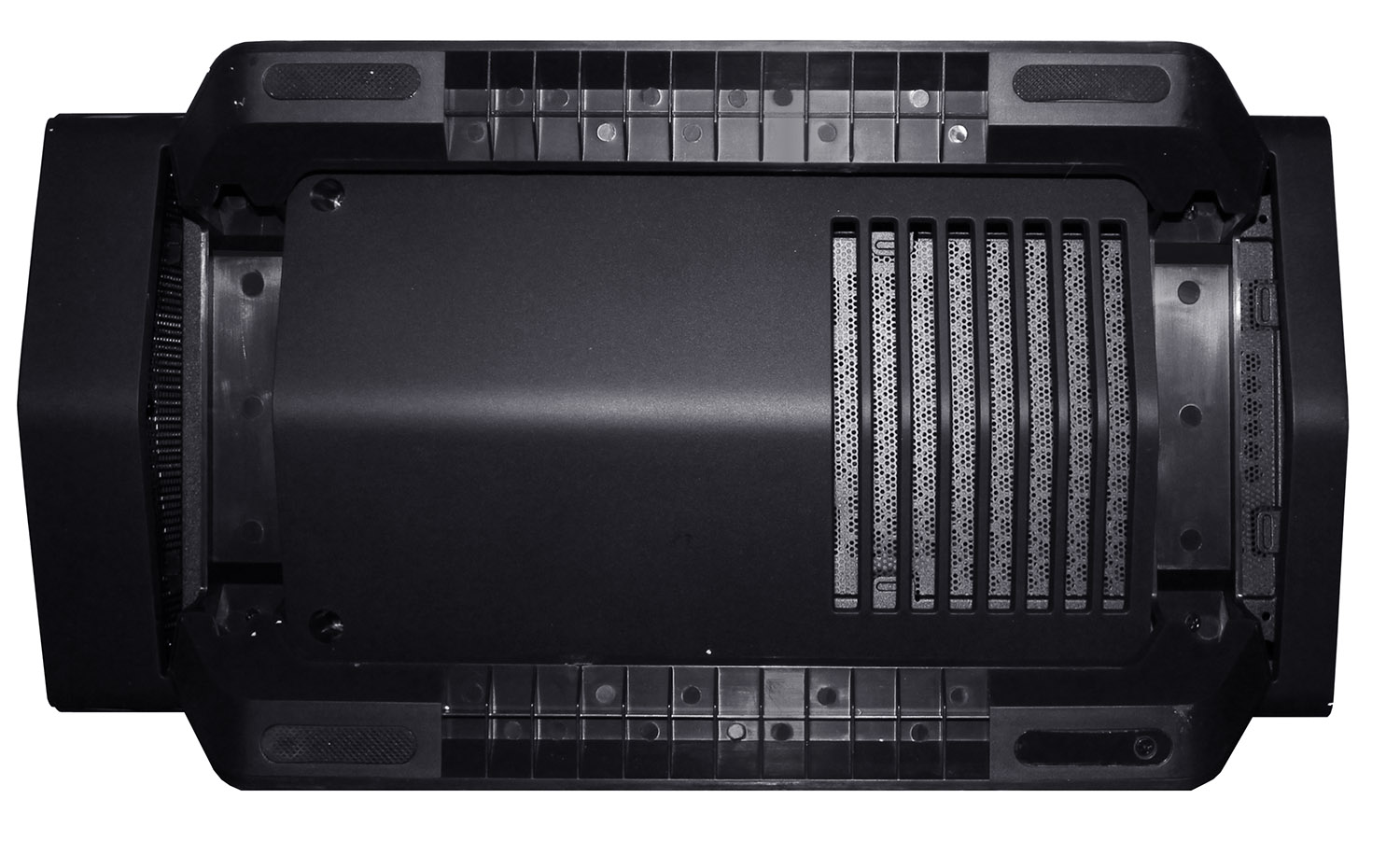 На дне корпуса видно вентиляционное отверстие для блока питания, закрытое пылевым фильтром. Кроме того, здесь стоит уделить внимание ножкам, конструкция которых позволяет не беспокоиться за вентиляцию.