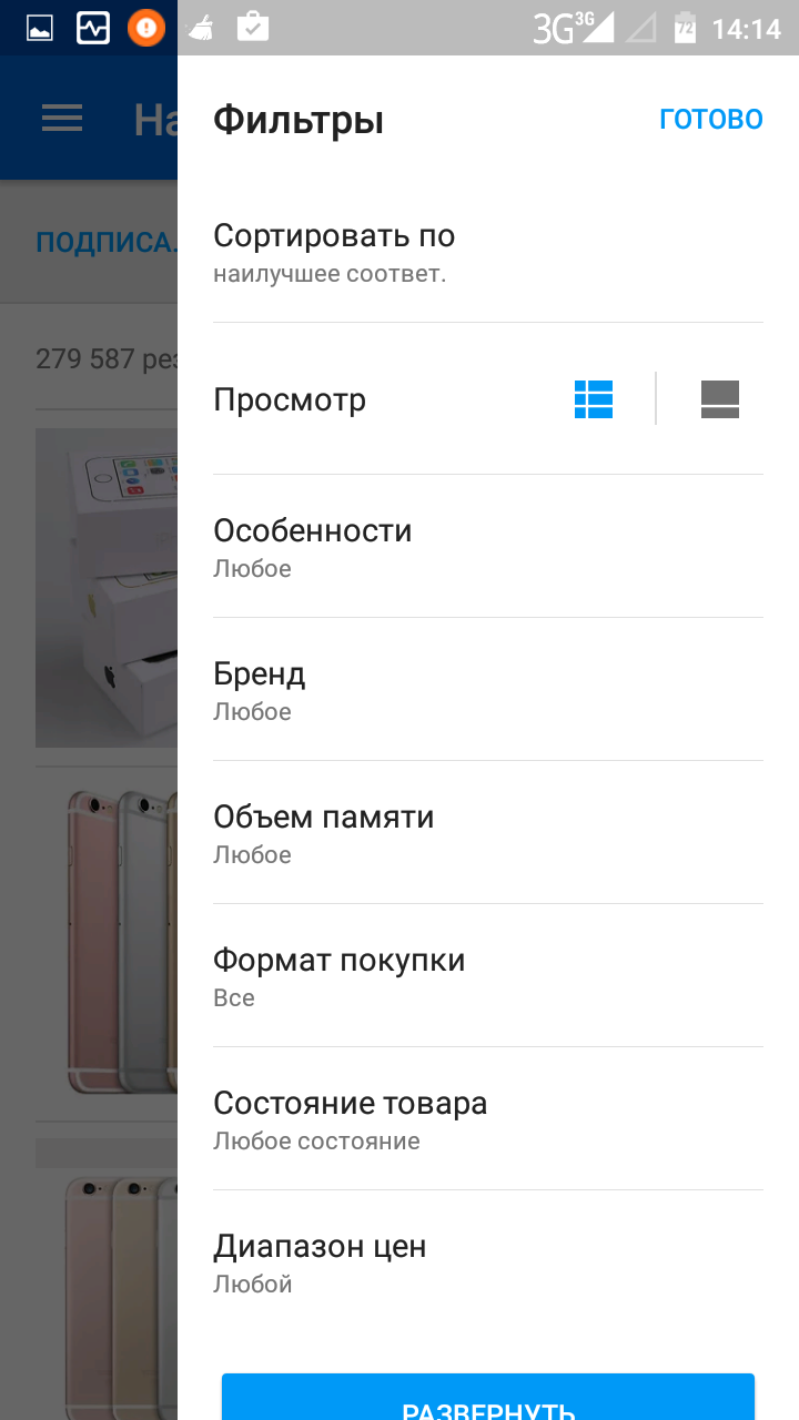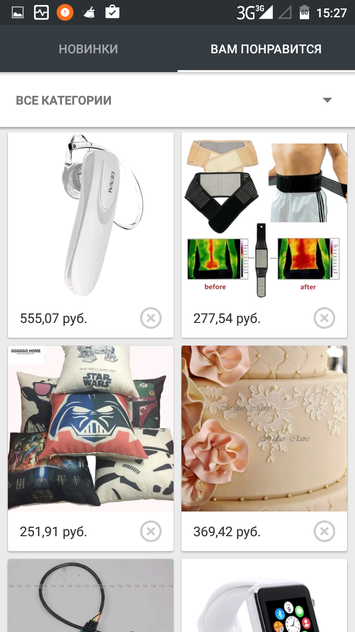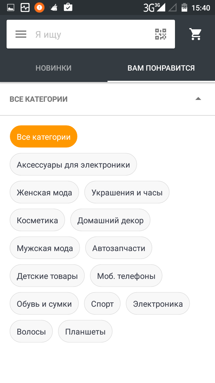 Приложение сразу синхронизируется с веб-сервисом и отображает последние просмотренные там товары. Категории товаров конкретизированы, есть строгая градация на подкатегории, например, «Мобильные телефоны» включают не только умные часы, но и видеотелефоны, винтаж и так далее.