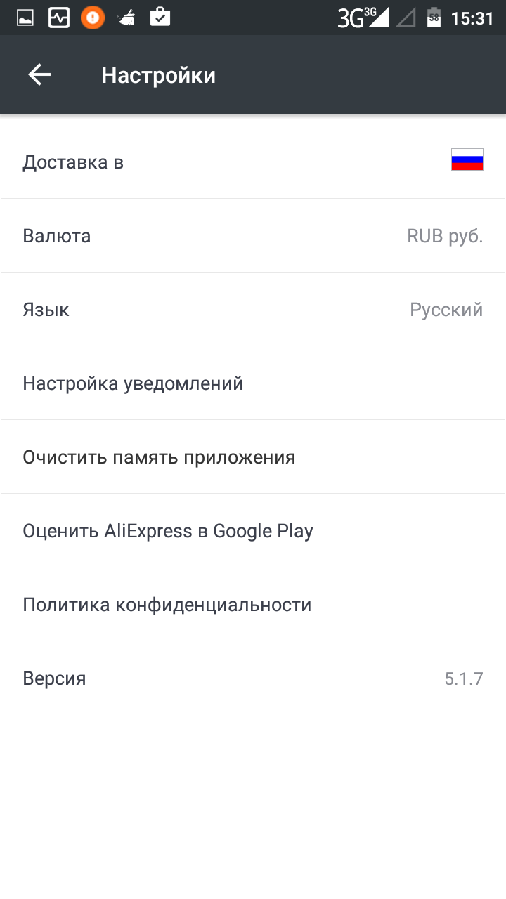 В оных выбираем страну доставки, валюту для оплаты, настраиваем уведомления в статус-баре, а также очищаем кэш приложения, коего накапливается немало.