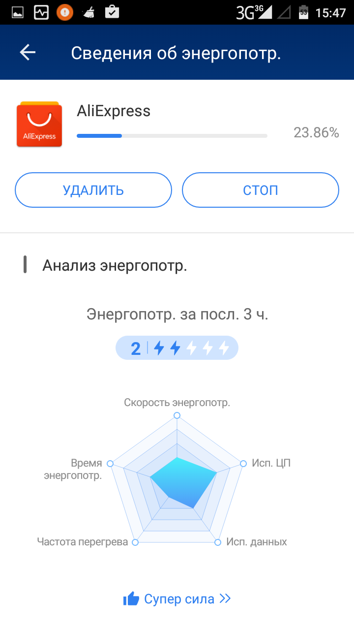 Клиент потребляет не более 200 Мбайт, напрягая процессор на 0.5%. Батарея при этом проседает на весомые 23% со скоростью энергопотребления в 66 мВт. Наверное, это самый главный недостаток AliExpress Shopping App, ставящий под сомнение его использование в течение дня.
