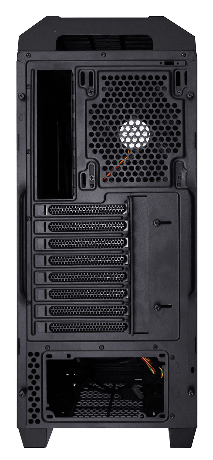 Сзади все стандартно для компоновки с нижним размещением блока питания. Над его посадочным местом располагаются восемь слотов расширения с металлическими заглушками.