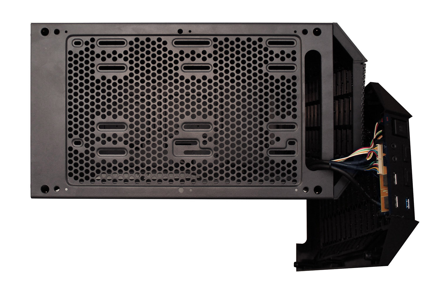 После ее снятия мы получаем доступ к посадочным местам для двух 140 мм или 120 мм вентиляторов, либо радиатора системы жидкостного охлаждения.