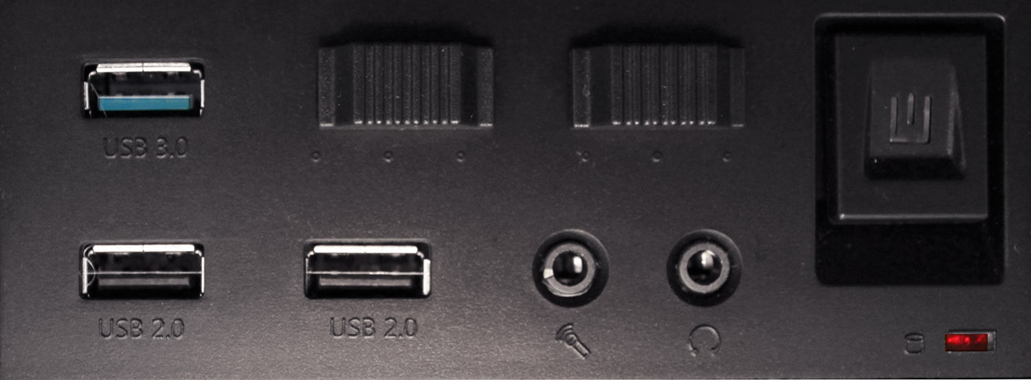 Теперь пару слов о последнем. В верхнем ряду слева-направо находятся порт USB 3.0, два переключателя оборотов вентиляторов, кнопка питания, совмещенная со светодиодным индикатором; в нижнем ряду – два порта USB 2.0, разъем микрофона и наушников, красный светодиодный индикатор активности дисковой подсистемы.