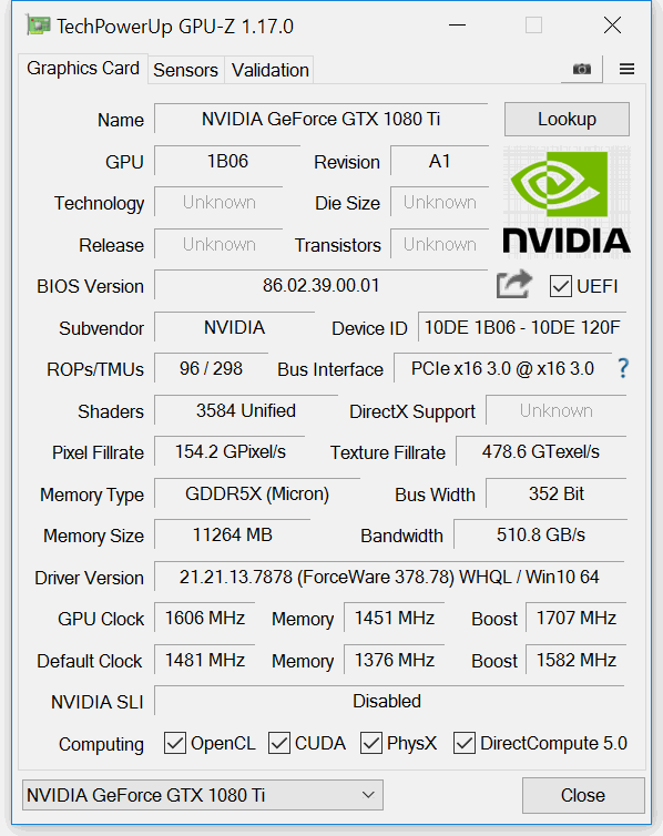 | GeForce GTX 1080 Ti | 1480/2750 | 1870/2900 | 378.78 |