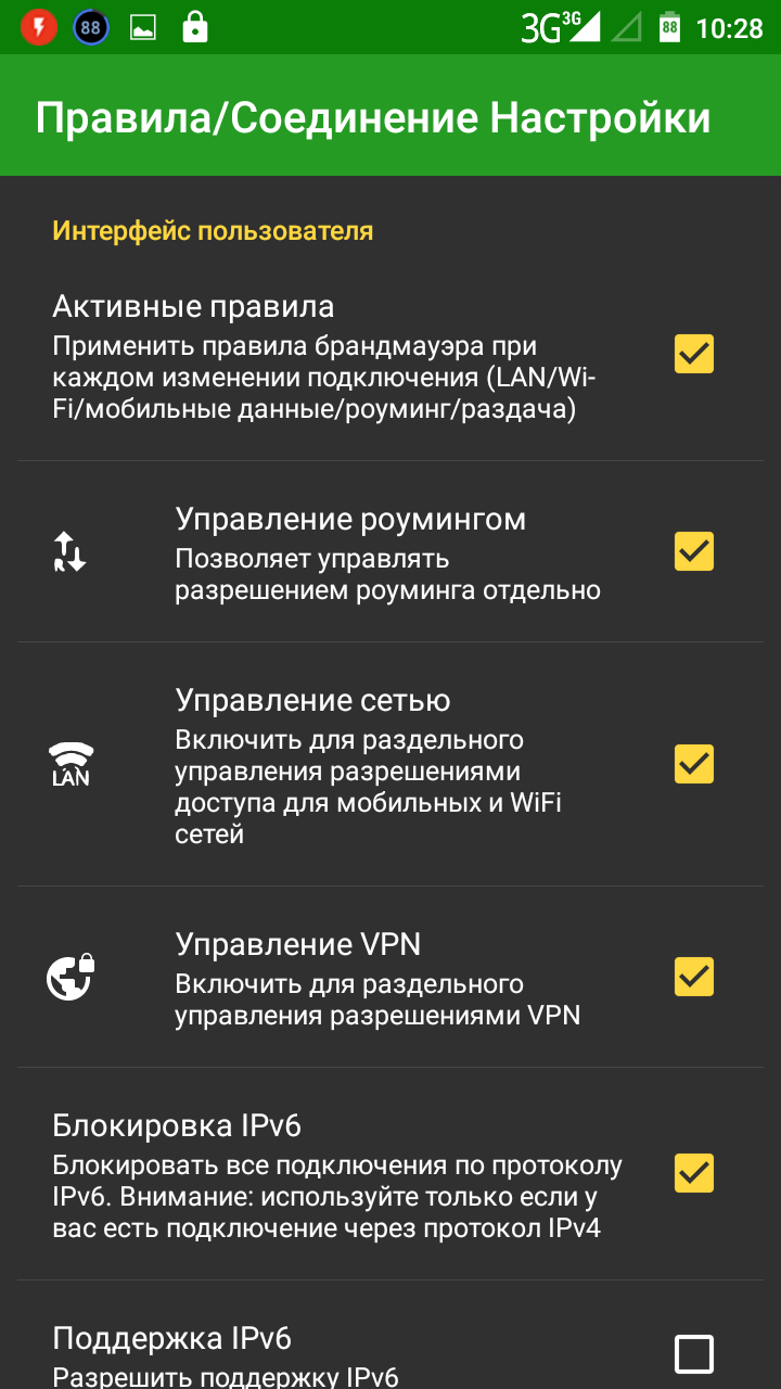 Предусмотрена возможность блокировать все подключения по протоколу IPv6 или, наоборот, разрешить последний. Вот оно, преимущество root-прав, однако, если вы не понимаете, о чем идет речь, лучше в настройках ничего не трогать.
