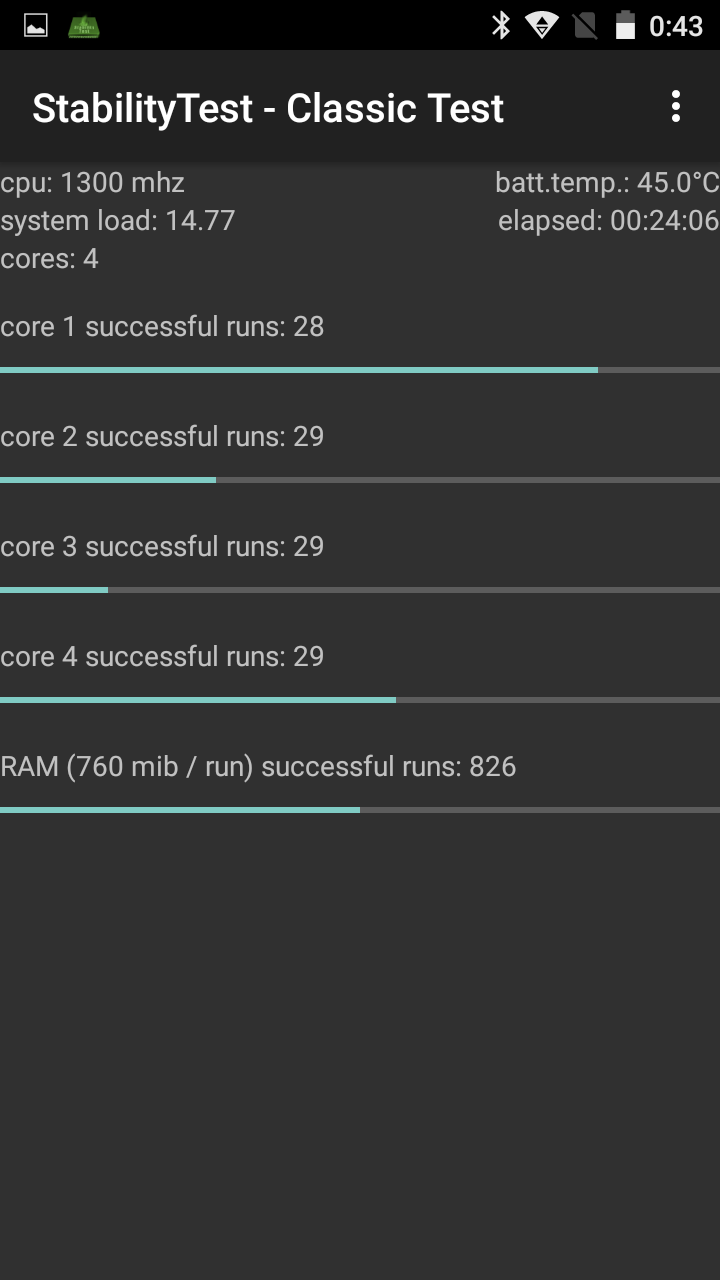 Со стабильностью у аппарата серьезных проблем нет, но при длительном тесте частота процессора может показывать нестабильное поведение. Нагрев корпуса при максимальной нагрузке смартфона практически равномерный и не сильный, да и установленный чип в целом не отличается особым пылом.