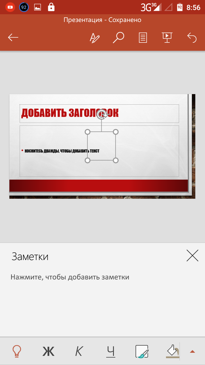 Редактирование отдельного слайда по сравнению с десктопной версией программы минимально, но этого вполне достаточно для средней руки презентации без лишних финтифлюшек. Есть форматирование текста, никто не мешает быстро изменить сам макет, добавить изображение или вставить фигуру, а также добавить заметку.