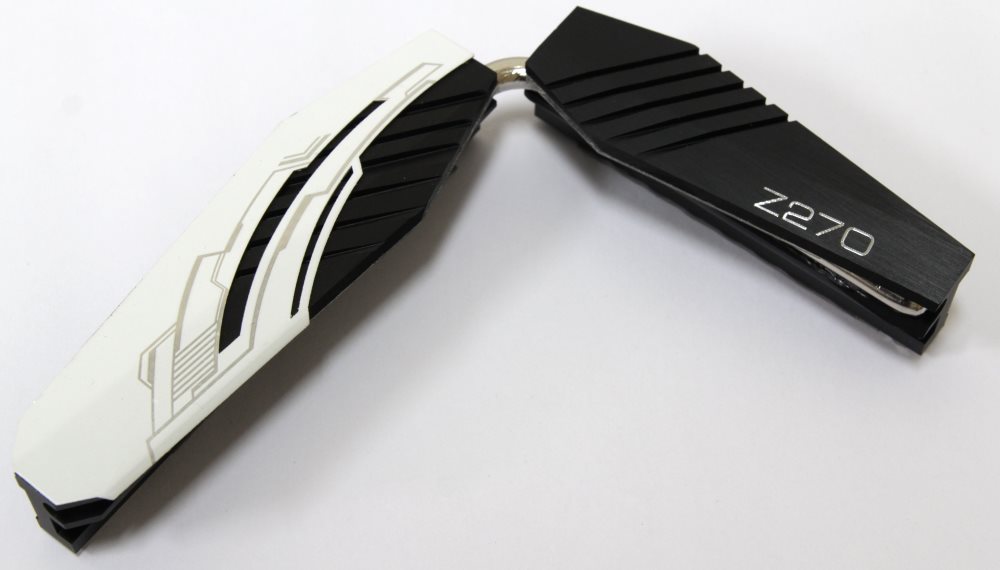 Чтобы придать законченность внешнему стилю и оформлению платы, на одном находится декоративная тоненькая пластинка белого цвета. Кроме того, радиаторы соединяются друг с другом тепловой трубкой диаметром 6 мм, которая проходит через специальные канавки. В качестве термоинтерфейса здесь используется терморезинка серого цвета.