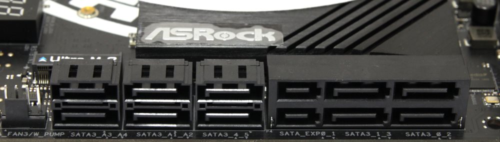 Производители материнских плат иногда расширяют функциональность. Вот и здесь такая же ситуация. Вбок выведено десять портов, четыре из которых образуют два SATA-Express.