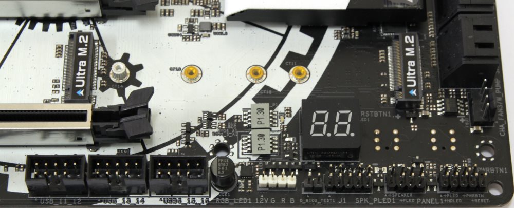 Еще здесь можно увидеть двойной семисегментный индикатор для отображения POST-кодов загрузки и инициализации, разъем для RGB лент и коннектор вентилятора или помпы СЖО. Левее по нижнему краю находятся три колодки USB 2.0.