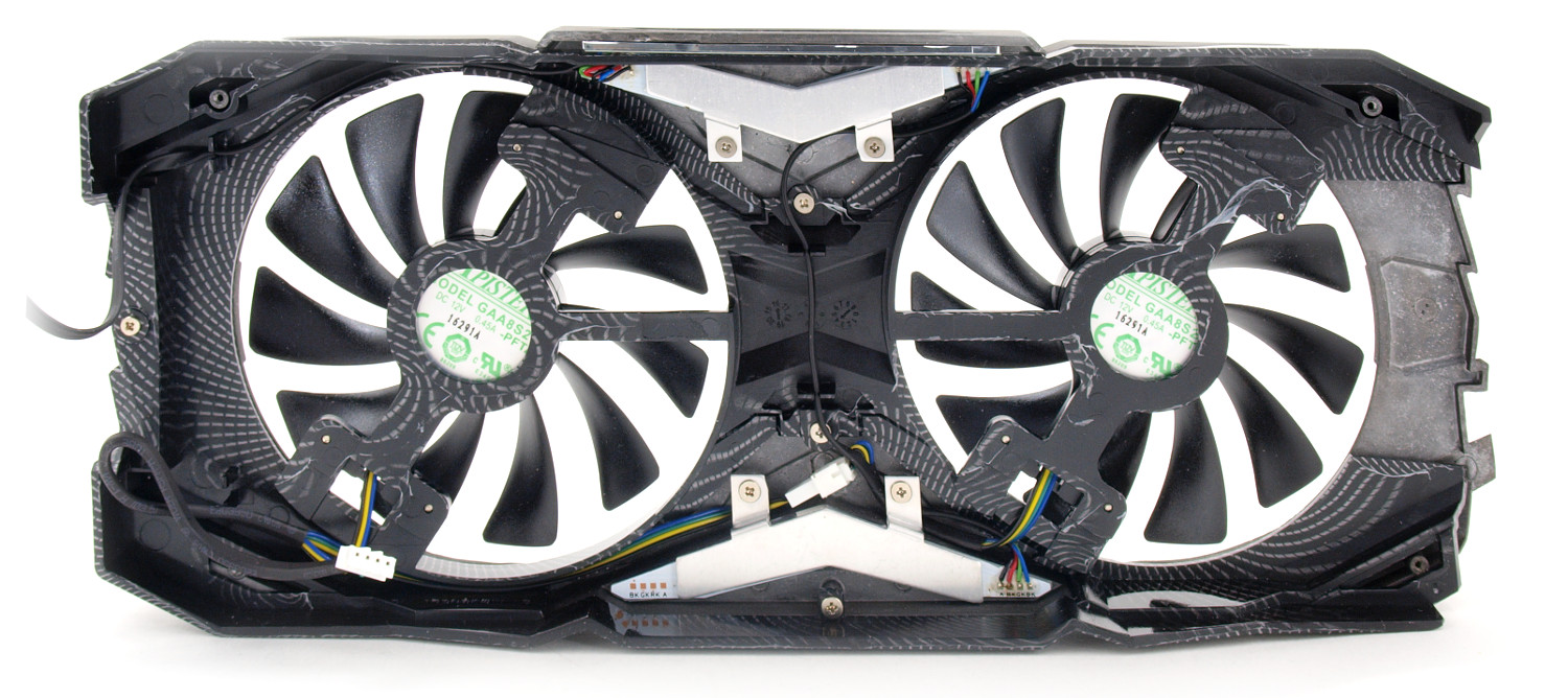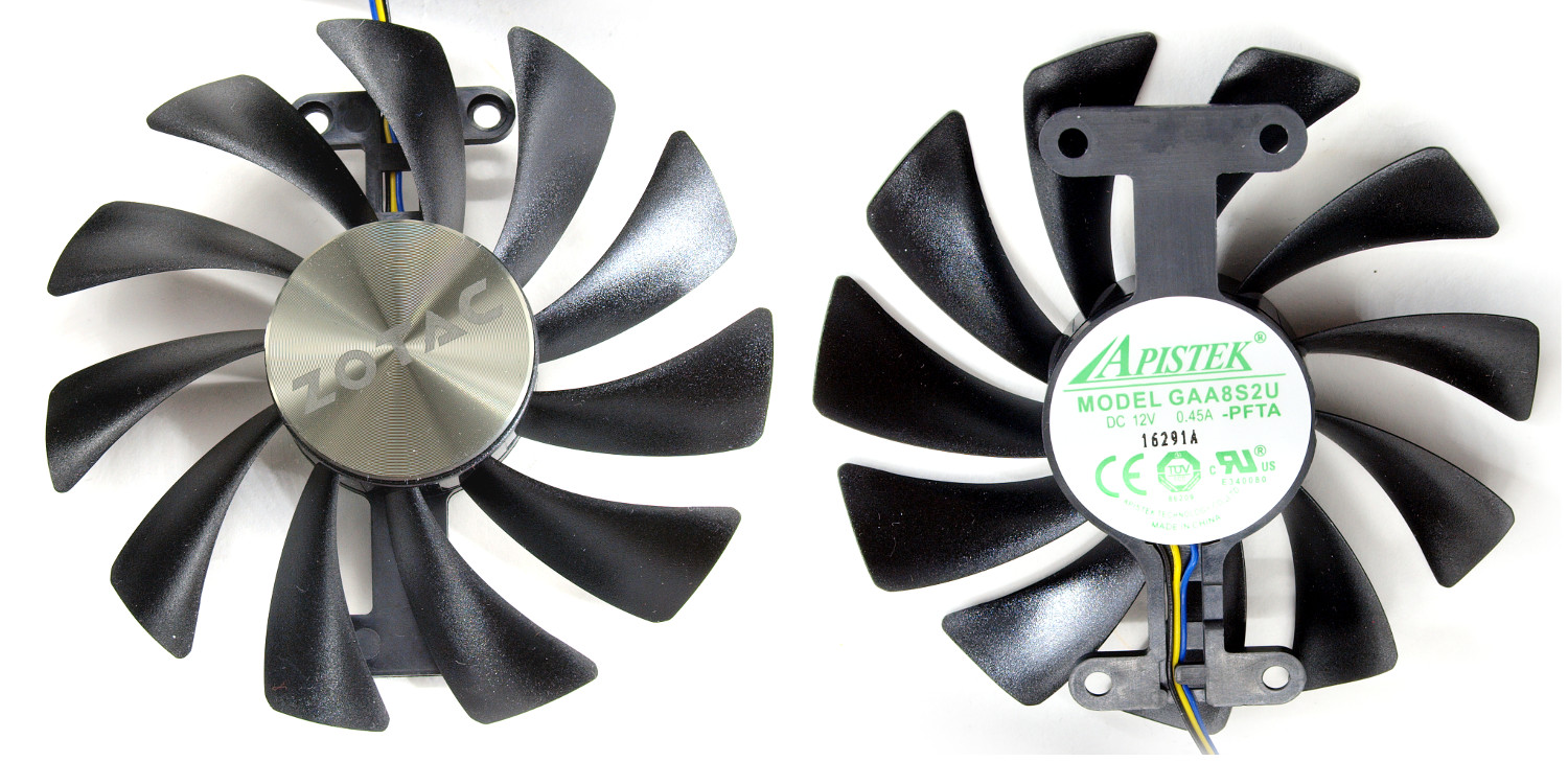 В качестве активной части выступают два вентилятора производства Apistek, модель GAA8S2U-PFTA. Это явное отличие от прошлого участника, где вертушки были изготовлены Ecotherm, модификация GFM10012H12SPA. Диаметр крыльчатки составляет 95 мм, несмотря на индекс в наименовании «8s» и подразумевающиеся 80 мм.