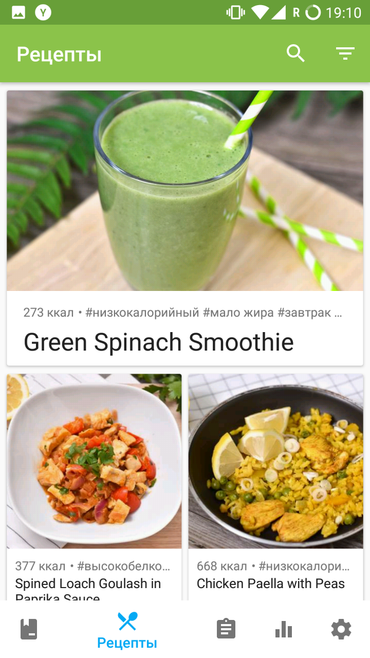 Если вы обратите внимание на нижнюю часть экрана, можете заметить панель с рецептами, планами питания и статистикой. Все перечисленное сделано на высшем уровне. Если это рецепты, то они с подробным описанием, яркими картинками и полезной информацией. Если это диеты, то это специально для вас созданные и отлаженные планы питания.