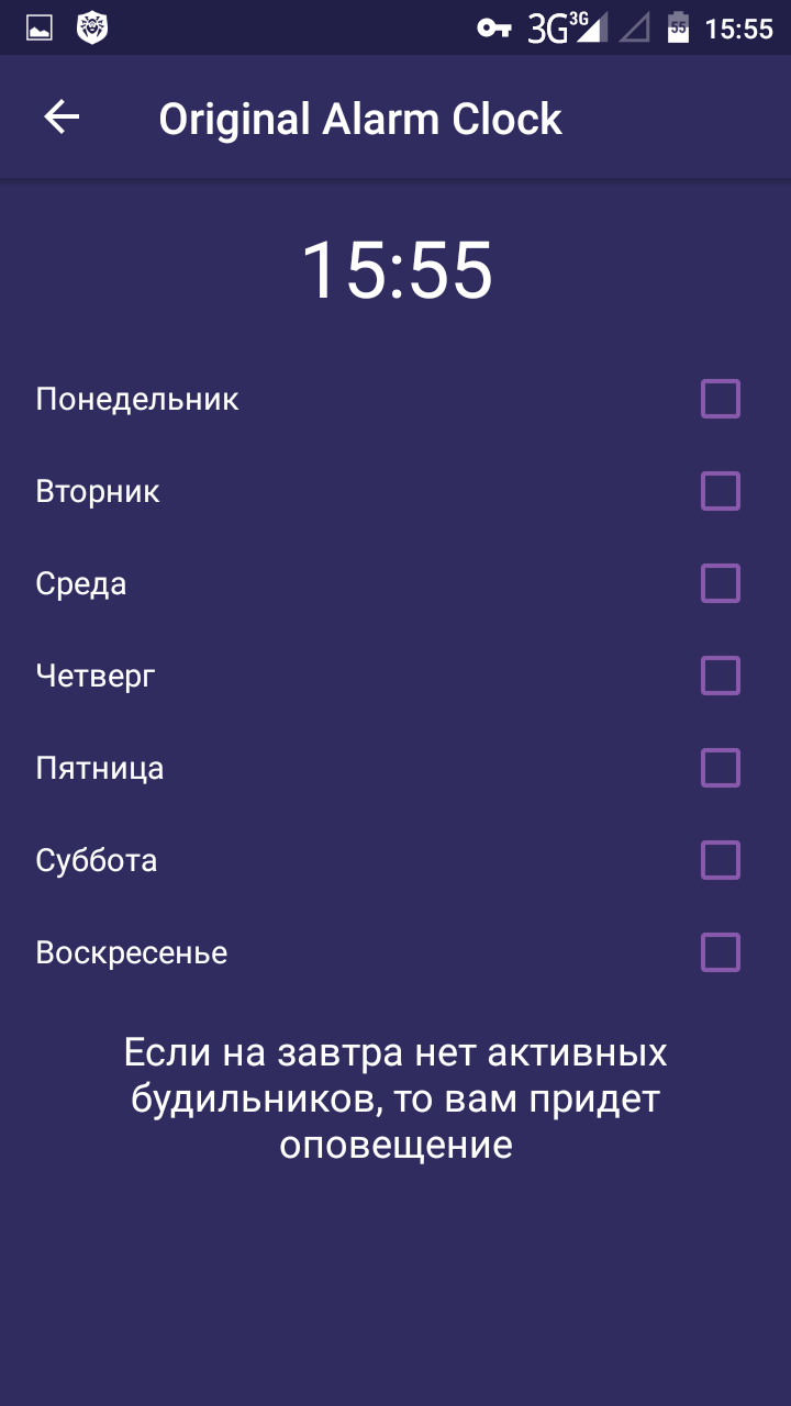 В правом верхнем углу находятся настройки, видимо, основные, так как вопреки заявлению разработчика их мало. Так, можно активировать уведомления в статус-баре, указать день, с которого начинается неделя, а также выбрать рабочие дни. Если на завтра нет активных будильников, то придет оповещение. Мелочь, а приятно, ведь порой мы забываем включить будильник после отпуска.