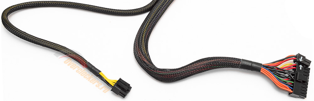 На основных неотключаемых шнурах размещены составные разъемы CPU 4+4-pin и Mainboard 20+4-pin. Такой набор гарантирует совместимость БП с максимальным числом материнских плат.